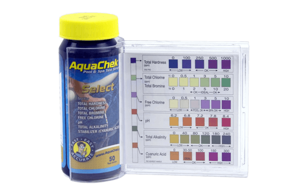 Aquachek Select 5-in-1 test strips. 50 strips per bottle. Sold only by the bottle. Water test strip tests for Total Chlorine, Free Chlorine, Total Hardness, Total Alkalinity, and pH all on one strip. Just dip the strip into the water sample, shake and match the color to get results. 5 different tests per strip. Designed to meet the unique needs presented by the higher water temperatures in Spas, Aquachek Select 5-in-1 Test Strips provide comprehensive testing ensuring both clean and healthy water and protection against damage from ph fluctuations and scale formation.